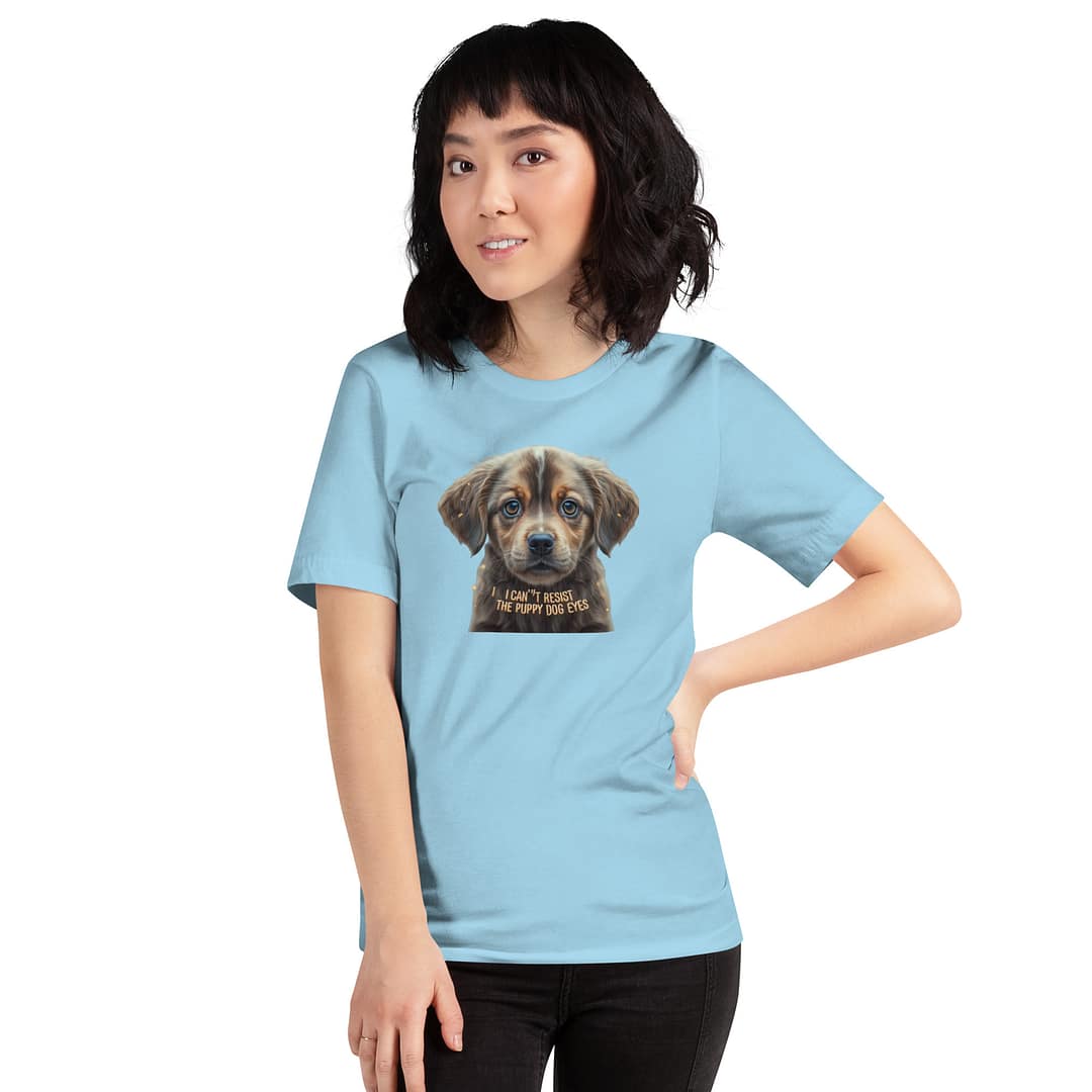 Elevate your dog-loving style with our “I Can’t Resist the Puppy Dog Eyes” t-shirt featuring an endearing image of a pup’s gaze. Express your affection for furry friends in this comfortable and captivating design.